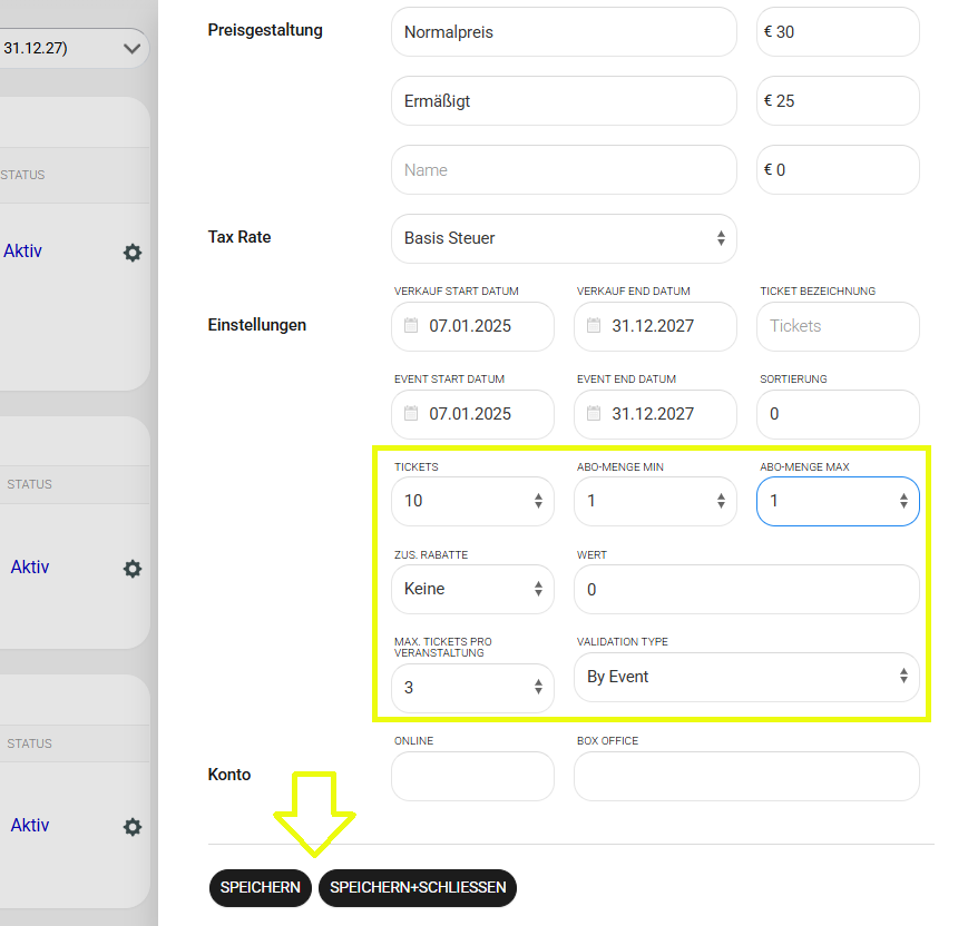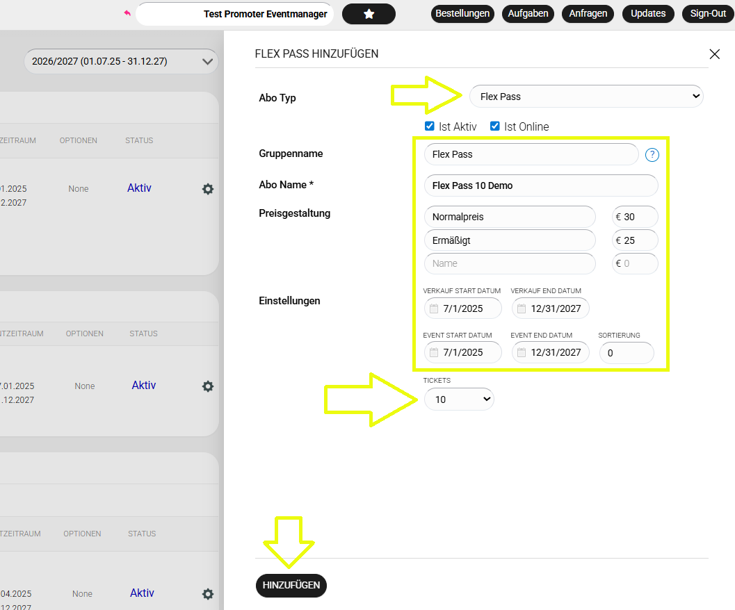 - Abo-Menge min/max: Begrenzt die Anzahl an Flex-Pässen, die ein Kunde während einer Transaktion erwerben kann.
