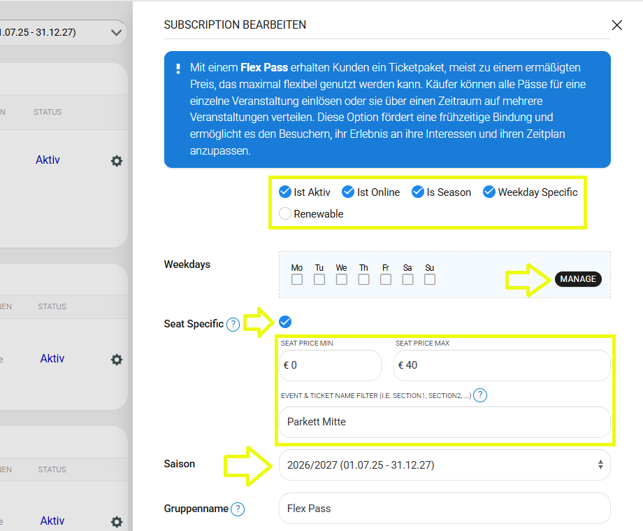 - Is Season: Der Flex-Pass kann nur für Events innerhalb der unten definierten Saison angewendet werden.
