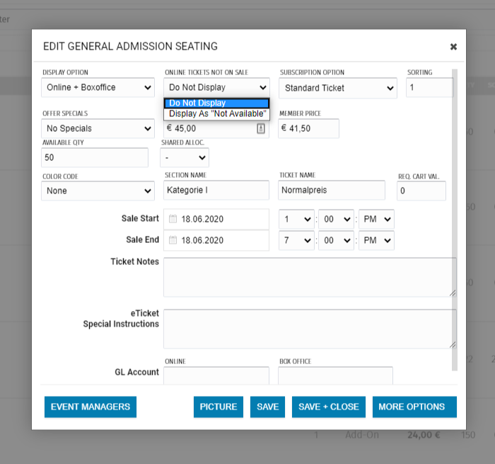 In der Administration der Tickets sowohl in der Veranstaltung wie auch in den Preis-Templates könnt Ihr diese Administration vornehmen.