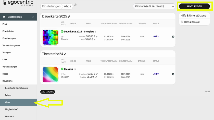 3. Gib die Details für das Abo der neuen Spielzeit über "Hinzufügen" an.