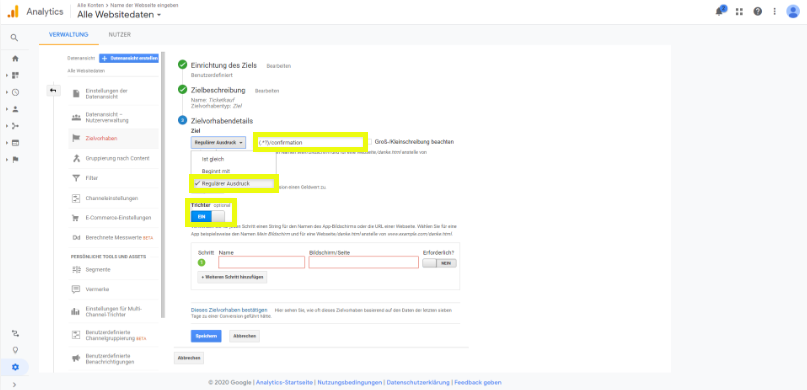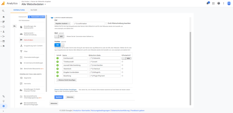 Klicke am Ende auf „dieses Zielvorhaben bestätigen“, um die Zielangaben zu speichern. Wenn alles gespeichert ist, wird der Goal Funnel gemessen.