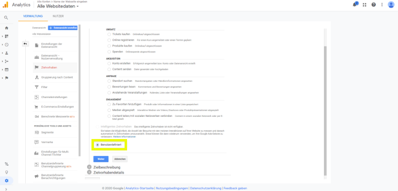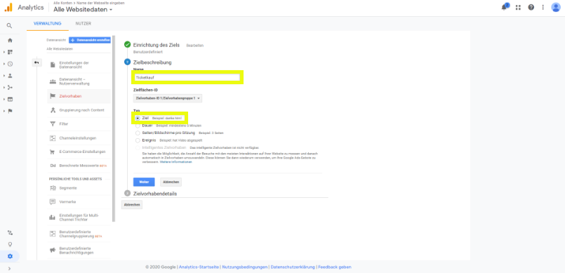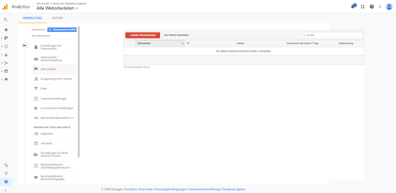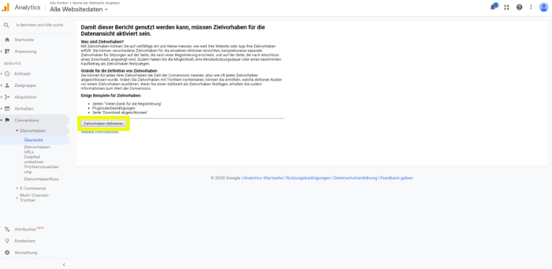 Melde dich bei Google Analytics an und erstelle ein neues Zielvorhaben, in dem du unter „Conversions“ die Option „Zielvorhaben“ und„Übersicht“ auswählst. Klicke danach auf „Zielvorhaben definieren“ und dann auf „Neues Zielvorhaben“