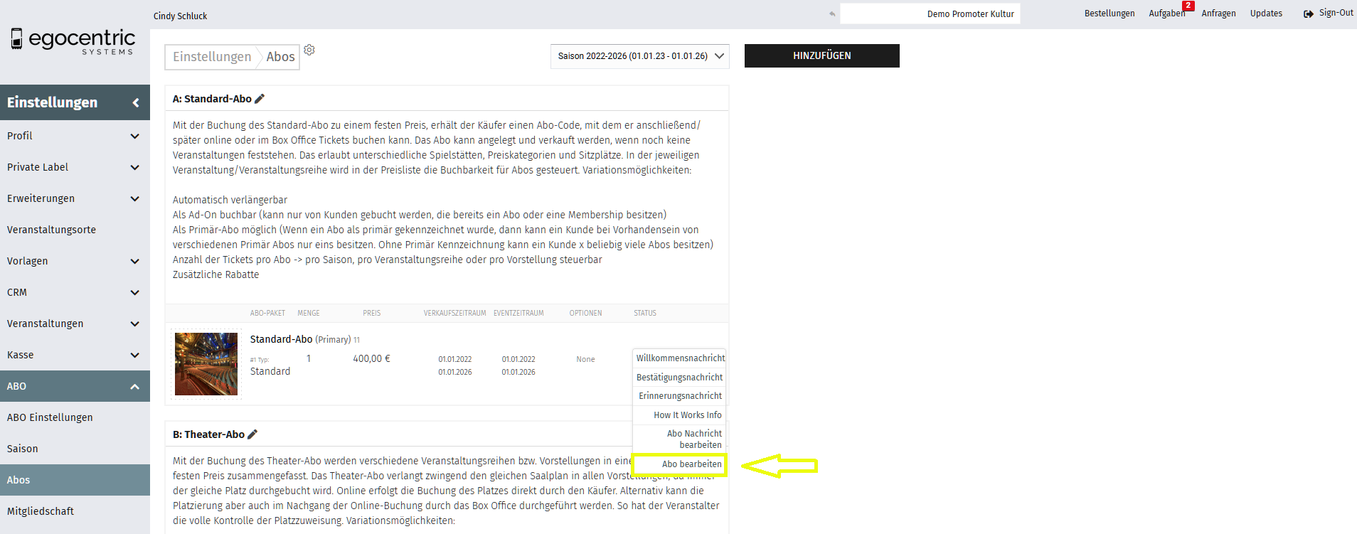 Melde Dich im Eventmanager an. Über die linke Navigation gelangst Du über Einstellungen > ABO > Abos zu Deinen erstellten Abonnements. Scrolle zum gewünschten Abonnement, das Du verlängern möchtest und drücke das Bearbeitungssymbol "Zahnrad".