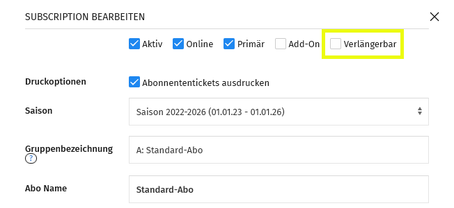 Setze einen Haken bei der Option "Verlängerbar". Damit aktivierst Du, dass das entsprechende Abonnement in eine neu angelegte Saison mit übertragen wird.