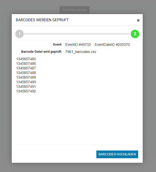 Nachdem du auf Hochladen geklickt hast, werden dir die ersten Codes angezeigt und klicke dann auf Barcodes hochladen, um den Import abzuschließen.