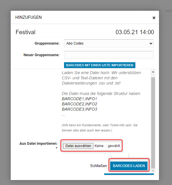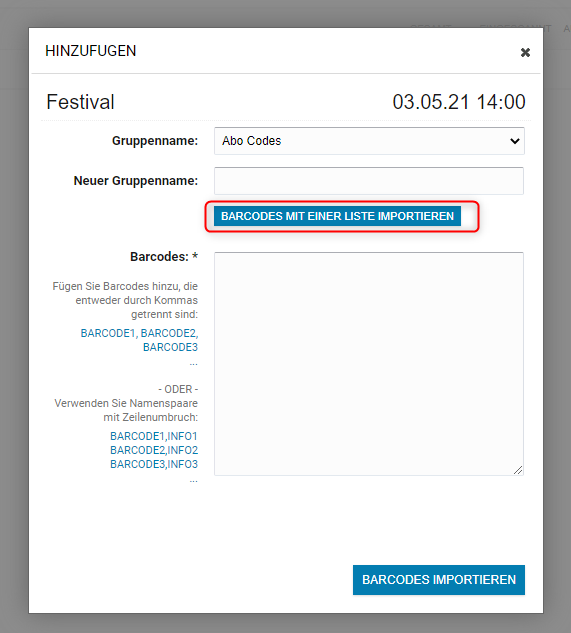 Die Codes und die Informationen zum Ticket werden nun in das Barcode Feld eingefügt. Wenn so weit alles passt, klicke auf den Button Barcodes Importieren.