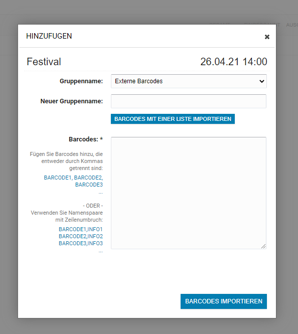 Sobald du alle werte eingetragen hast, klicke auf den Button Barcodes Importieren um das Hinzufügen der Codes abzuschließen.