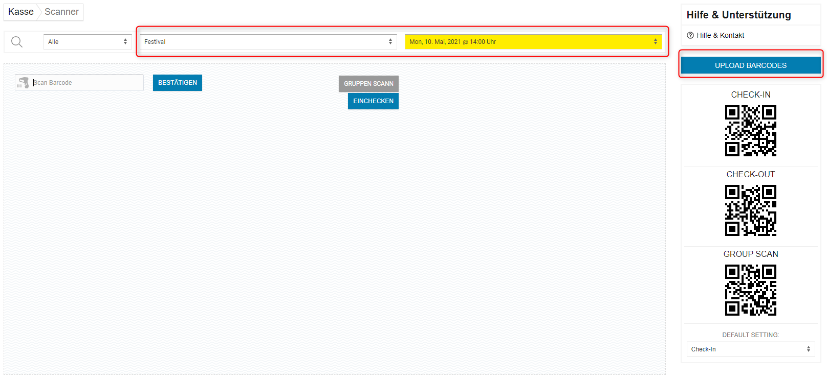 Als zweiten Weg bieten wir dir an die Barcodes direkt in der Scan-Oberfläche im Bereich Kasse zu importieren. Wechsel dazu zur Kasse und dann zum Menüpunkt Scan. Wähle hier nun dein Event und dein Veranstaltungsdatum aus, zu dem du Codes importieren möchtest.