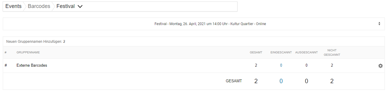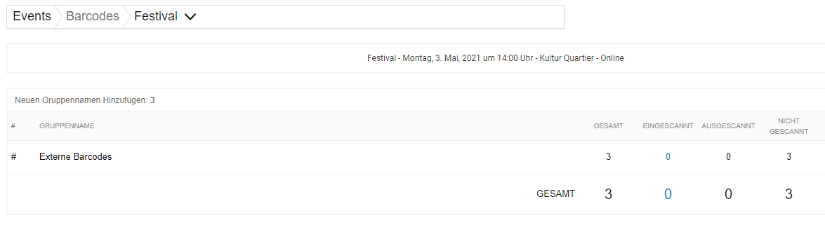Du gelangst nun zurück zu Übersicht und siehst dort nun bei der Auswahl des Events und des Veranstaltungstages die Anzahl der importierten Codes und wie viele davon schon gescannt wurden.
