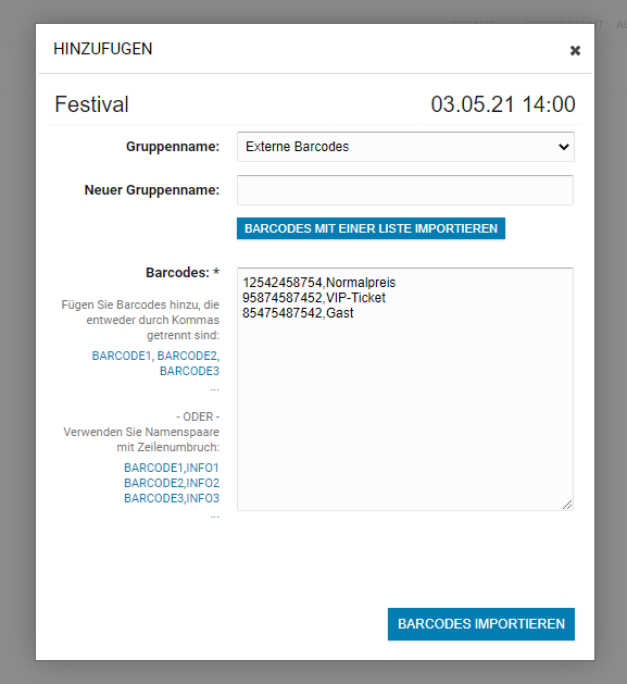 Du kannst hier dann in das Feld Barcodes entweder nur die Codes durch ein , getrennt eingeben oder zu jedem Code auch noch eine Information mit hinzufügen. Dies kann ein Name oder eine Bezeichnung des Tickets sein.