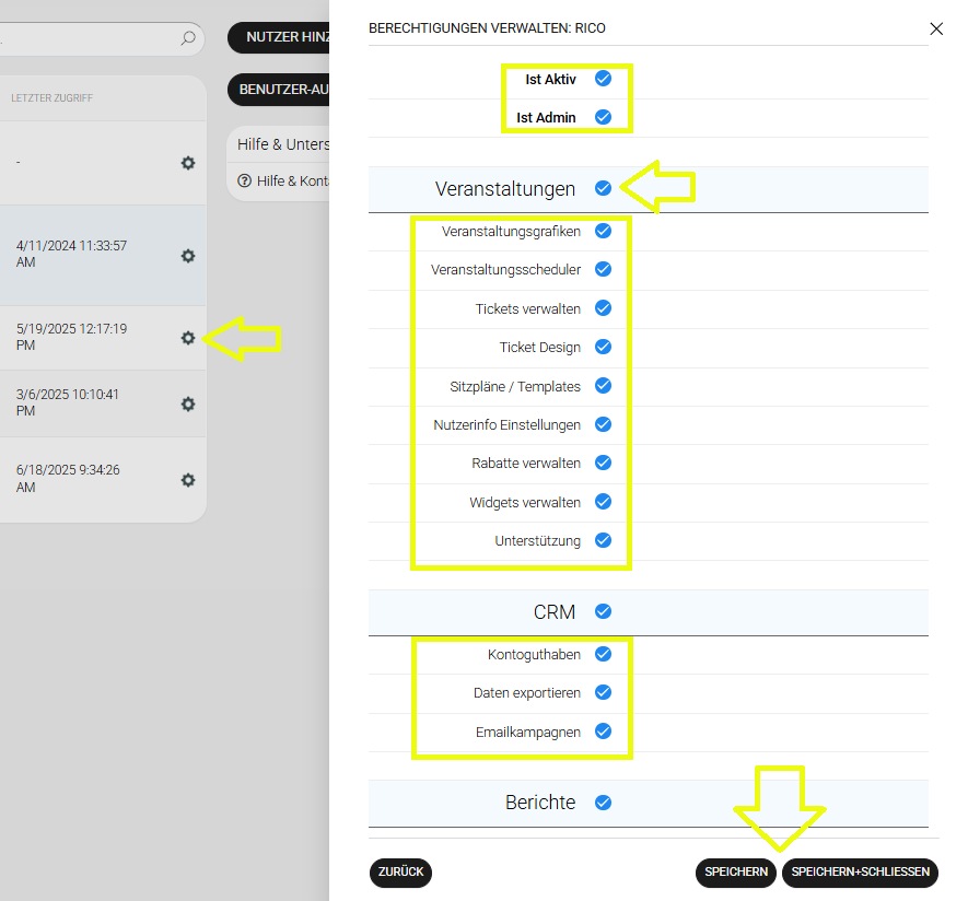 - Berechtigungen bearbeiten: individualisiere den Zugriff auf unterschiedliche Bereiche des Eventmanagers