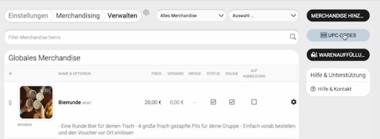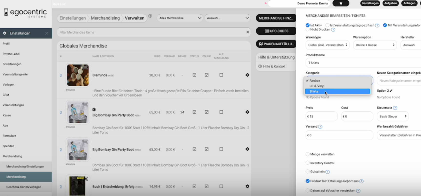 Artikel anlegen: Gehe in den Bereich "Merchandise" und erstelle einen neuen Artikel, z.B. ein T-Shirt für 15 Euro. Lade ein passendes Bild hoch, füge eine Beschreibung hinzu und bestimme, ob der Artikel global verfügbar sein soll, also sowohl online als auch an der Kasse.