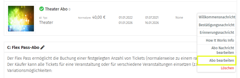 Abonnements und Dauerkarten kannst Du ab sofort direkt in die Veranstaltung in Deinen Ticketshop integrieren. Diese Funktion eignet sich besonders gut für mehrtägige Veranstaltungen, für die Du ein übergreifendes Ticket anbieten möchtest.