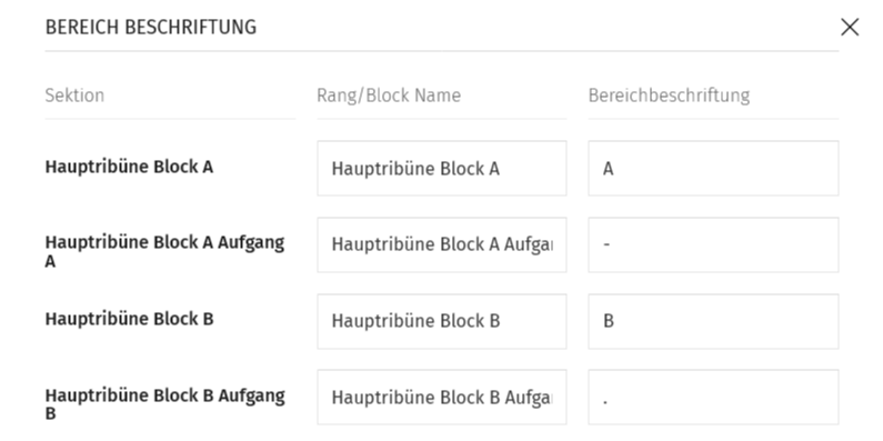 5. Fülle die Bereichsbeschriftung in den rechten Zeilen aus. Dieser Wert überschreibt im Sitzplan den Rang/Block Namen, um eine professionelle Darstellung sicher zu stellen.