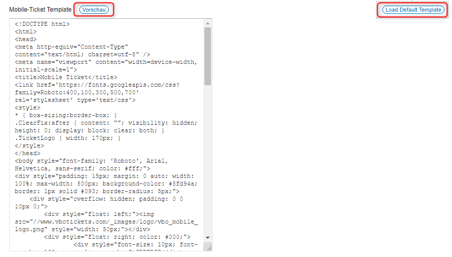 In der Konfiguration des mobilen Ticketlayouts ist es nun möglich das Standardlayout zu laden und anschließend zu bearbeiten. Zusätzlich kannst Du Dir dieses in der Vorschau mit anzeigen lassen.