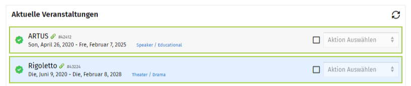 2. Öffne die Seite "Aktuelle Veranstaltungen". Wähle die entsprechende Veranstaltung mit Sitzplatzauswahl und klicke unter "Aktion auswählen" auf "Veranstaltungstage".