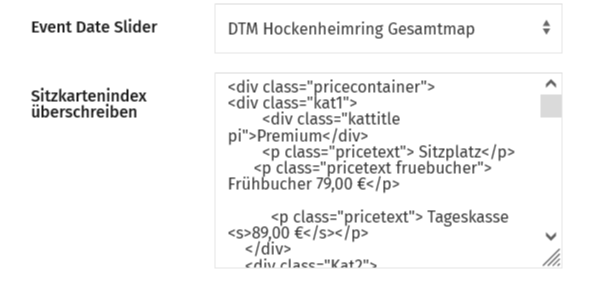 7. Du hast ebenfalls die Möglichkeit die Anzeige der Preiskategorien für das Abo / Wochenendticket zu überschreiben. Hierfür scrollst Du zum nächsten Feld "Sitzkartenindex überschreiben" und kopierst Deinen HTML-Code hinein.
