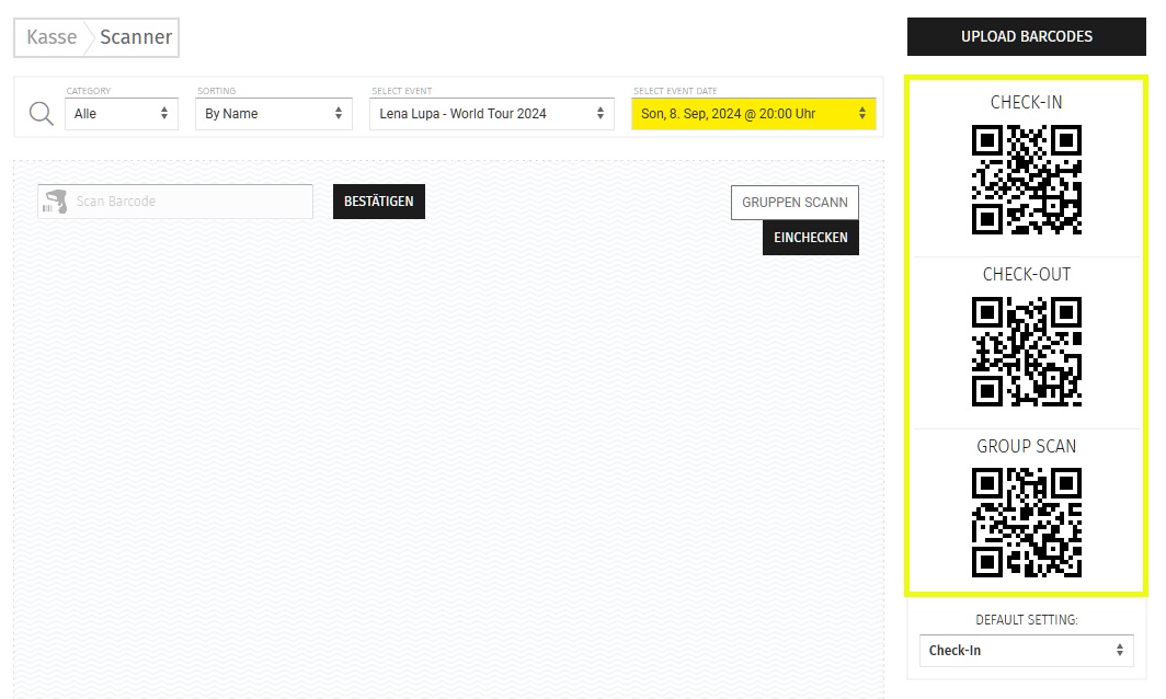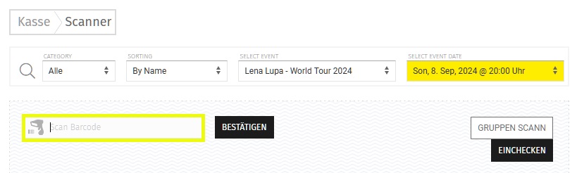 Anschließend hast Du die Option im Feld "Scan Barcode" den Ticket-Code manuell einzutragen. Alternativ kannst Du einen Barcodescanner an Deinen PC oder Laptop anschließen, um die QR-Codes auf den Tickets zu scannen.