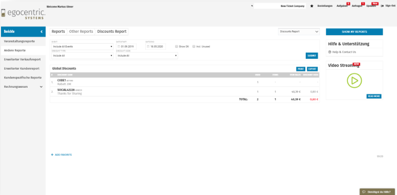 Als Erstes möchten wir auswerten, wie viel Rabatt du mit diesem Code gewährt hast. Dazu gehst du zu Berichte und kannst dort entweder unter Veranstaltungsreporte --> Discount Usage Report verwenden (dieser Report ist Veranstaltungsbezogen und gibt dir die Werte immer nur für eine bestimmte Veranstaltung aus) oder unter andere Reporte --> Discounts Report nutzen (Dieser Report gibt dir die Verwendung Veranstaltungsübergreifend aus).