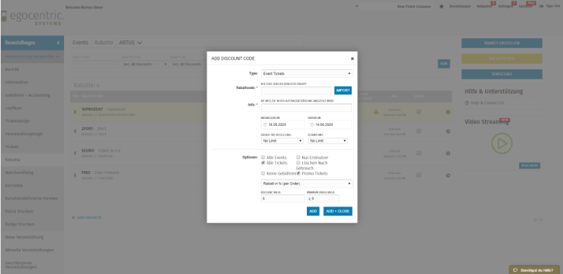 Die Konfiguration der Rabattcodes wird in den einzelnen Veranstaltungen unter dem Menüpunkt Rabatte vorgenommen.