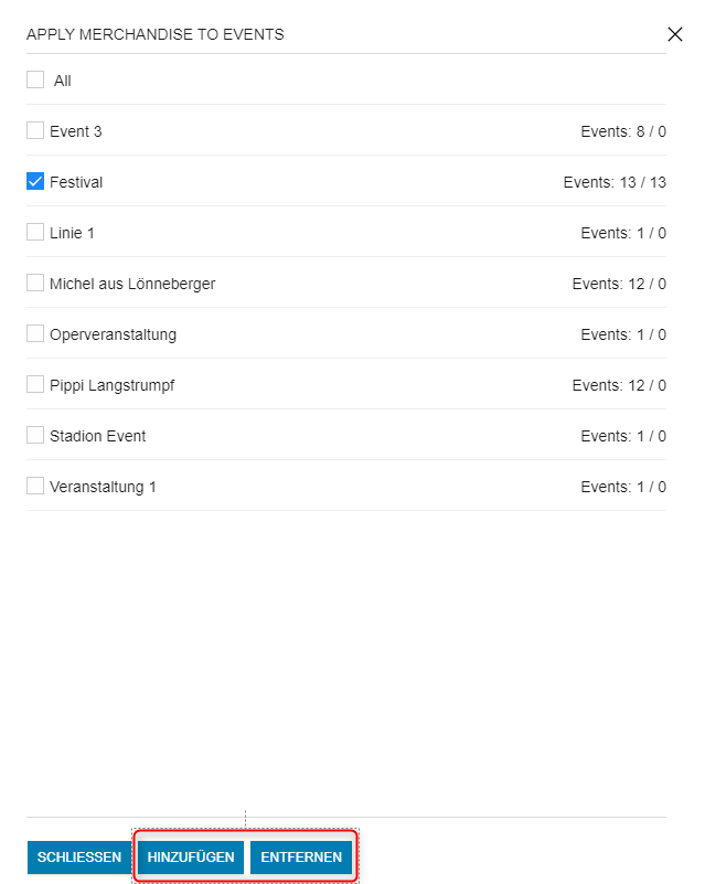Klicke dann auf Hinzufügen, um das Produkt zu den ausgewählten Events/Veranstaltungen zuzuordnen. Zum Entfernen der Events/Veranstaltungen wähle die Events/Veranstaltungen aus und klicke dann auf Entfernen.