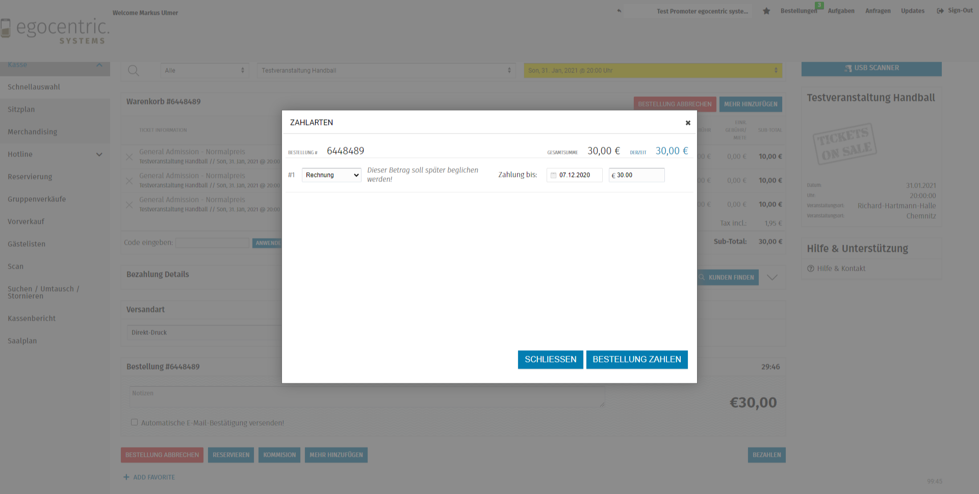 Hier kannst du nun ein Zahlungsziel auswählen und dann auf Bestellung Zahlen gehen. Die Buchung wird nun verarbeitet und anschließend kannst du die Tickets ausdrucken und die Bestellbestätigung versenden.