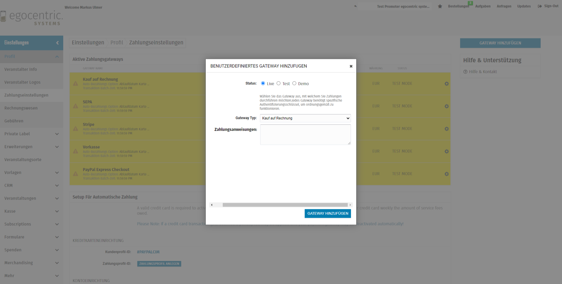 Die Einrichtung dieser Zahlart nimmst du unter Einstellungen --> Profil --> Zahlungseinstellungen vor. Klicke hier nun auf Gateway Hinzufügen um diese Zahlart hinzuzufügen.