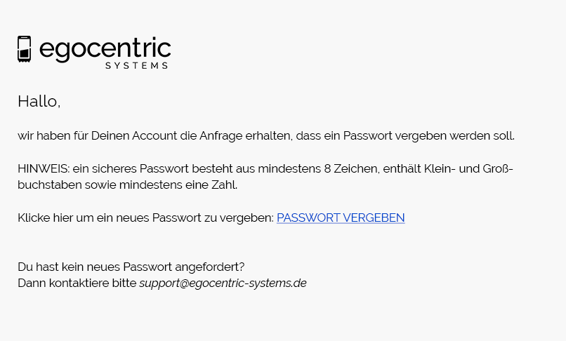 Die Passwortvergabe bzw. das Rücksetzen Deines Passworts läuft nicht mehr nur im System. Eine 2-Schritte Kommunikation per Anfrage im System und Benachrichtigung per E-Mail erhöhen die Sicherheit erheblich.