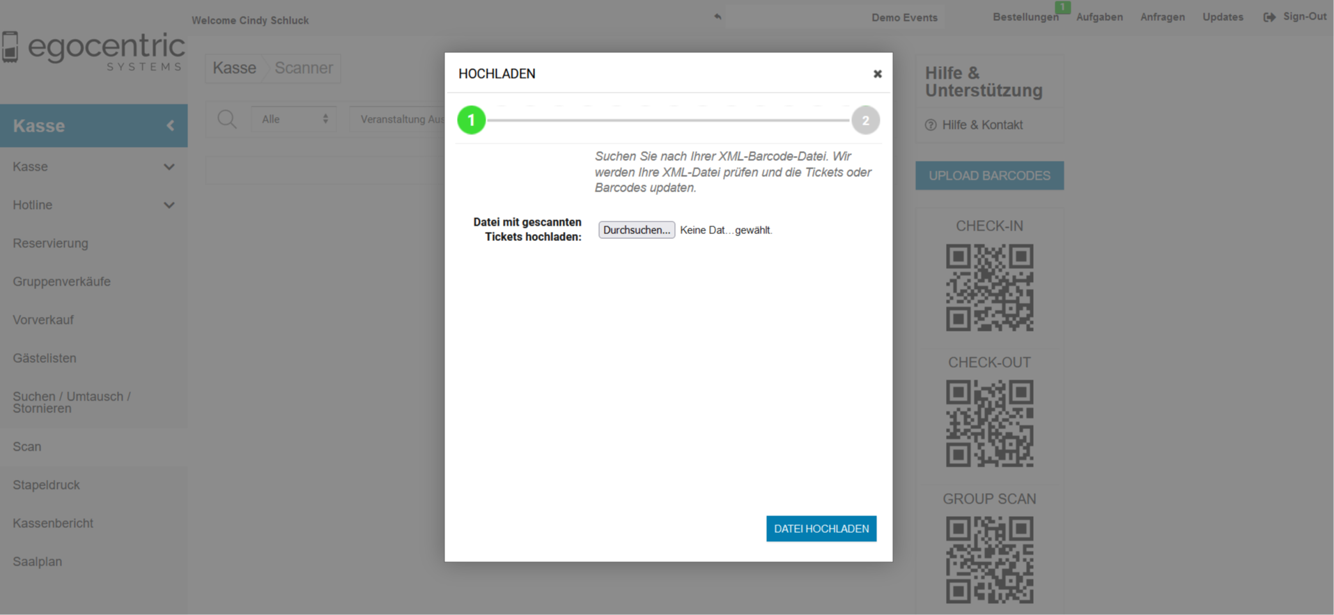 - Unter Kasse >> Scan findest Du die Barcodes für Check-In und Check-Out.